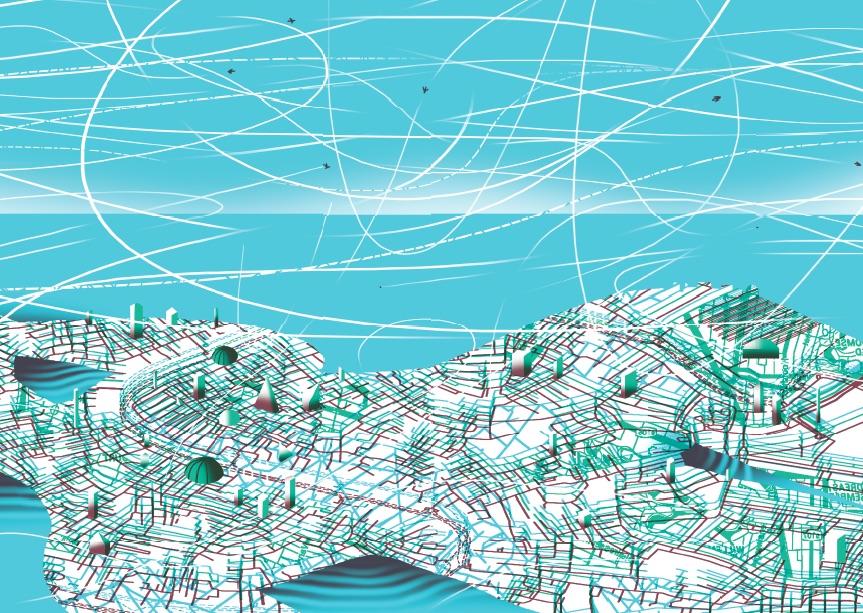 Na mape Smeraldíny by mali byť atramentmi rozličných farieb vyznačené všetky tieto trasy, na súši aj na vode, viditeľné aj skryté. Ťažšie je vyznačiť na papieri let lastovičiek, ktoré rozrážajú ovzdušie nad strechami, s nehybnými krídlami klesajú po neviditeľných parabolách, prudko vzlietajú, aby v letku schmatli komára, vzápätí znovu v špirále stúpajú nahor, tesne popri štíhlej vežičke: a v každom bode ich vzdušných trás prevyšujú všetky body mesta.